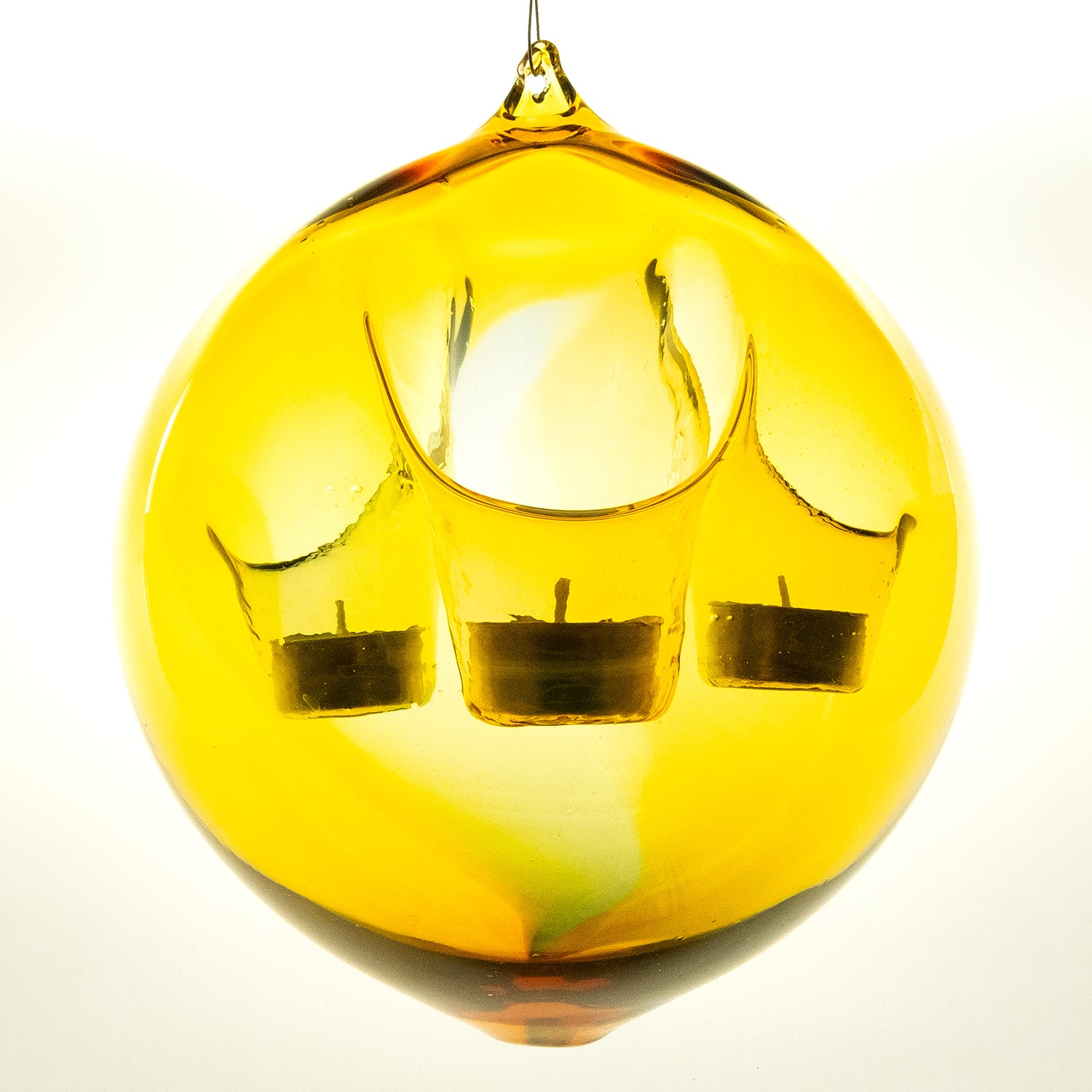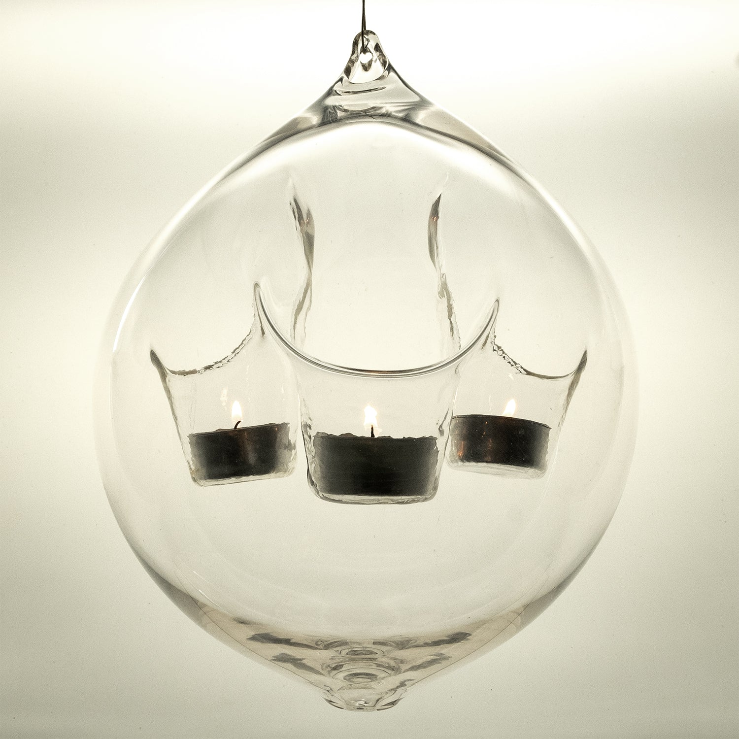 This is the hanging variant of the exotic tealight candle holder that was originally created in 1978 by Buzz Blodgett. Fill with water and food coloring of your choice via a small hole in the top center of the glass to create the illusion of solid colored glass! Or check out our colored variants for a more permanent solution.